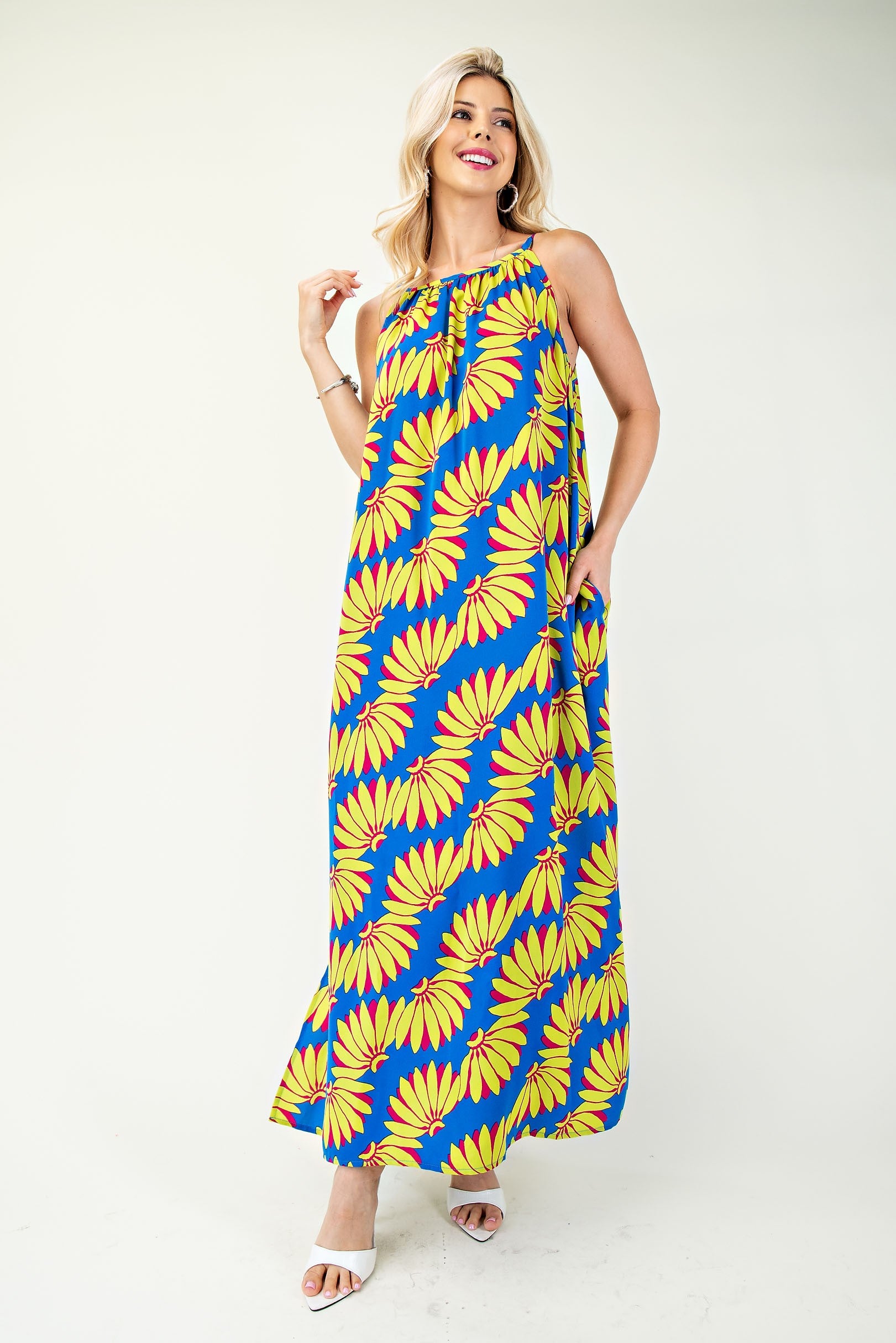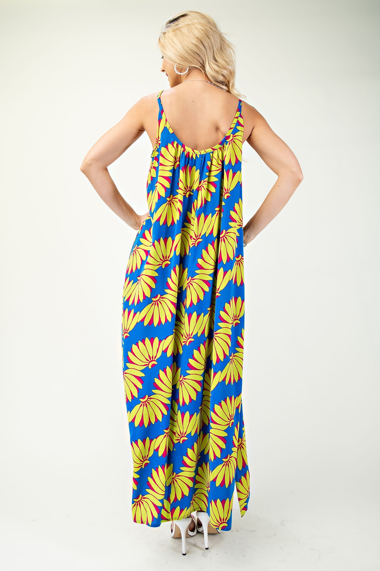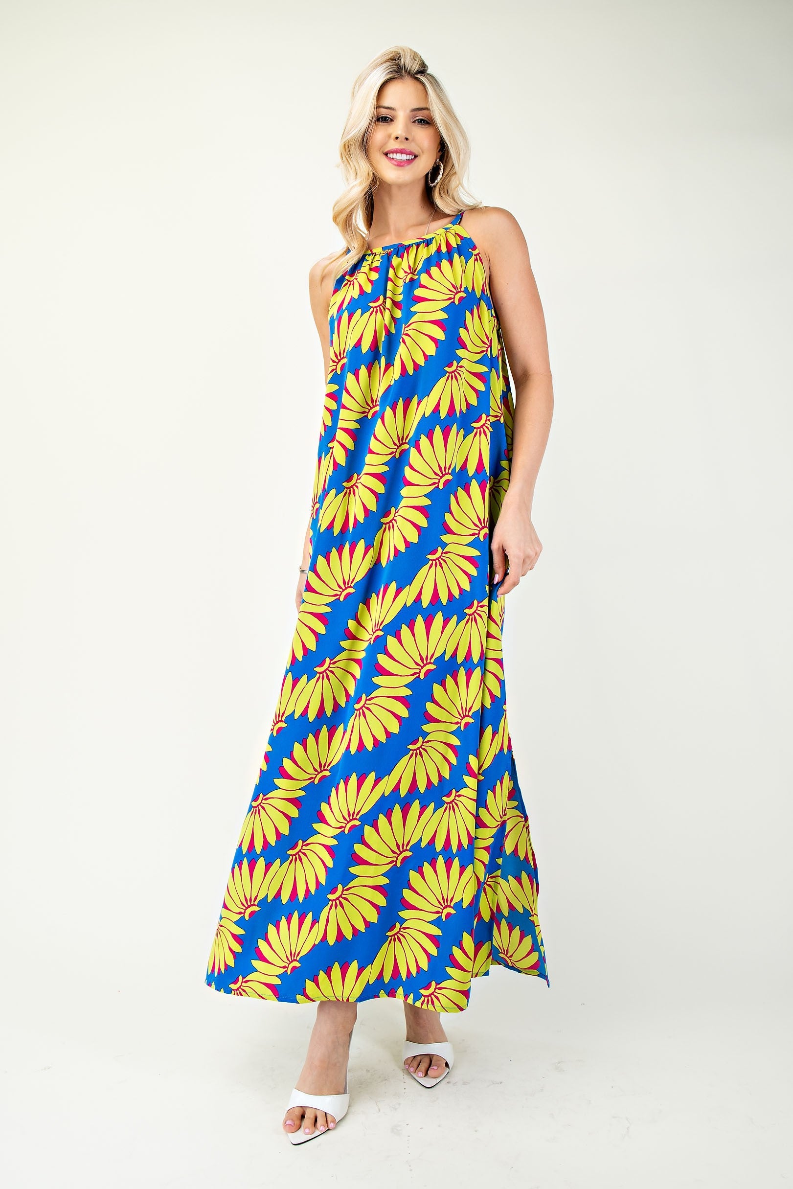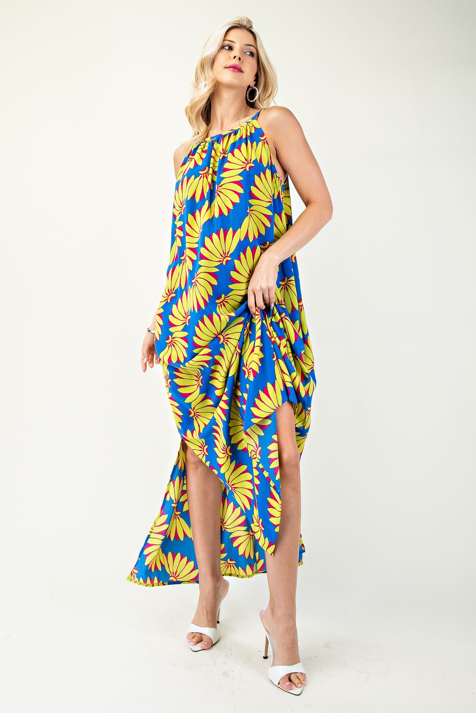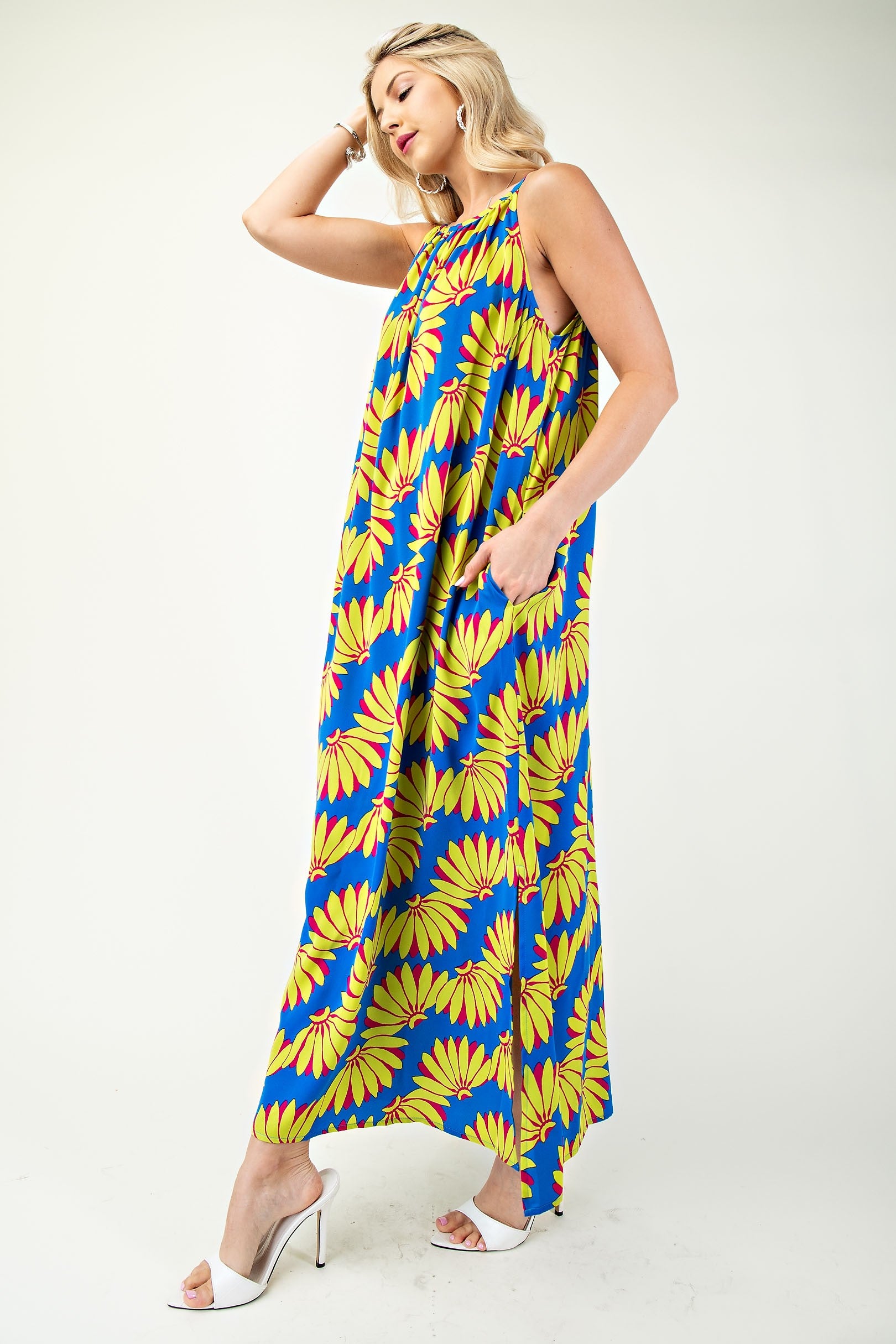 Disfruta de un look vibrante y elegante con nuestro Maxi dress con bolsillos y apertura lateral. Su diseño en azul, verde limón y magenta te harán destacar en cualquier ocasión.